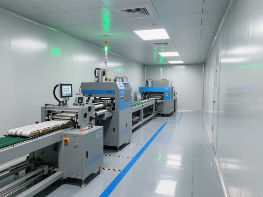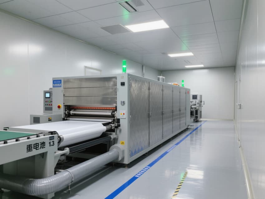 車間以銀灰色抗菌金屬彩鋼板搭建墻體與吊頂,搭配淺灰色防靜電環氧地坪,金屬質感的建材兼具抗電解液腐蝕、易清潔特性,地面藍色防靜電標識線清晰劃分涂布、卷繞、裝配等工序區域。頂部高效過濾器與定向層流系統,實現每小時18-22次空氣置換,配合除濕機組將濕度精準控制在20-30%RH,避免水分影響電芯性能。?