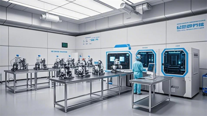 機(jī)械人研發(fā)實(shí)驗(yàn)室,未來科技風(fēng)格。實(shí)驗(yàn)室分為研發(fā)區(qū)、測(cè)試區(qū)、裝配區(qū)和辦公區(qū)。研發(fā)區(qū)占50%,測(cè)試區(qū)占30%,裝配區(qū)占10%,辦公區(qū)占10%。研發(fā)區(qū):防靜電環(huán)氧地坪(淺灰色),